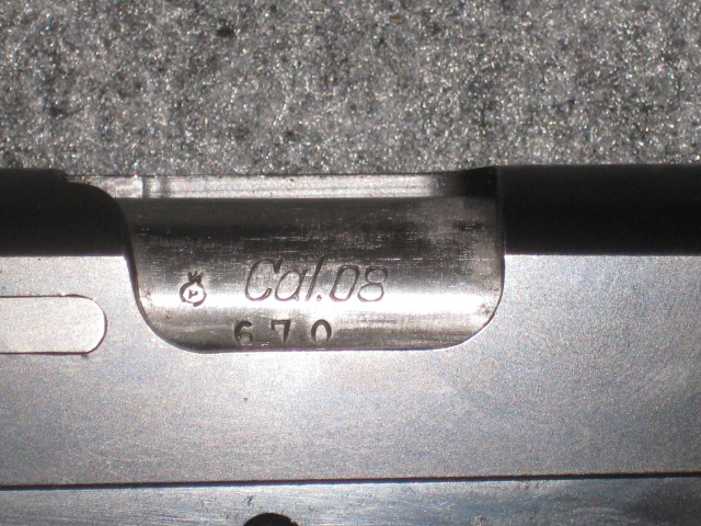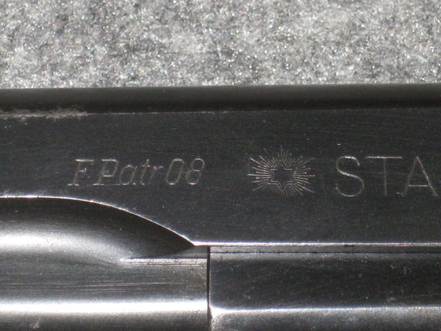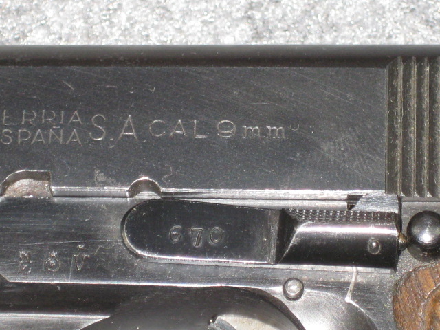 Linksseitige Schlittenbeschriftung: FPatr.08 Firmenlogo der Firma Star (Stern mit Strahlenkranz) STAR  B.Echeverrria Eibar Espana  S.A. CAL. 9mm spanisches Beschusszeichen unter den letzten drei Ziffern der S.Nr..Griffstück linke Seite: diverse spanische Beschusszeichen über dem AbzugsbügelAn der Unterseite des Griffrückens befindet sich die S.Nr.: 364670 und die Modellbezeichnung "B". An der Griffvorderseite befindet sich die Kennung LPN für die Landpolizei Niedersachsen. Die Anbauteile wie Sicherungsflügel und Verschlussfanghebel sind wie der Schlitten mit den letzten drei Ziffern der S.Nr. versehen. Der Lauf weist im Bereich des Auswurffensters die Bezeichnung Cal. 08 sowie Beschußzeichen und die letzten drei Ziffern der S.Nr. auf. Die Waffe hat die originalen schön erhaltenen mit Fischhaut verschnittenen Holzgriffschalen. Die Waffe besitzt einen buntgehärteten Hahn wobei der Lauf im Bereich des Auswurffenster, Auszieher und Abzug blank gehalten ist. In der Waffe befindet sich das Original Magazin mit der Bezeichnung "STAR" und den letzten drei Ziffern der S.Nr.